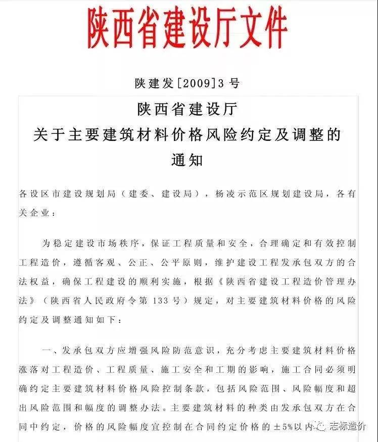1、發承包雙方應增強主要材料價格風險防范意識,充分考慮材料價格波動對工程造價、工程質量、施工安全的影響,施工合同必須明確約定主要建筑材料價格風險控制條款,不得采用無限風險,全部風險規定合同條款中的材料價格風險內容和范圍,主要材料的種類由發承包雙方在合同中約定,主要材料價格約定的風險幅度應控制在5%以內。這條和陜西省建設廳2009年頒布的陜建發【2009】3號文件的內容相似,卻又不同。